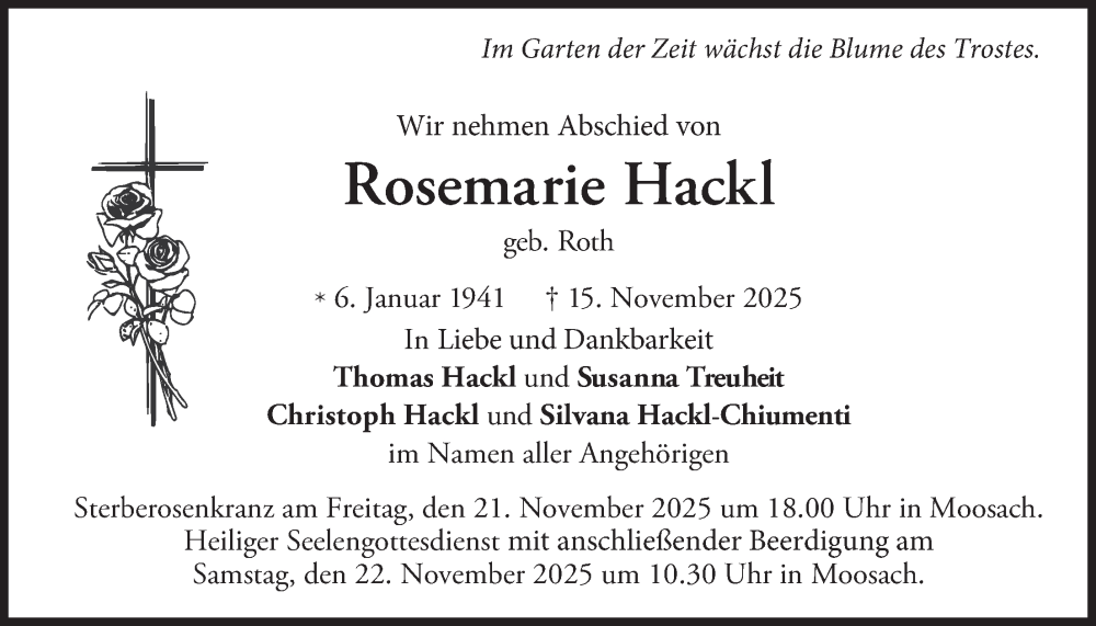 Hier finden Sie alle Traueranzeigen aus der Zeitung, die bisher für Rosemarie Hackl erschienen sind. Weitere Traueranzeigen, die in der Zeitung erscheinen, werden hier ebenfalls aufgelistet