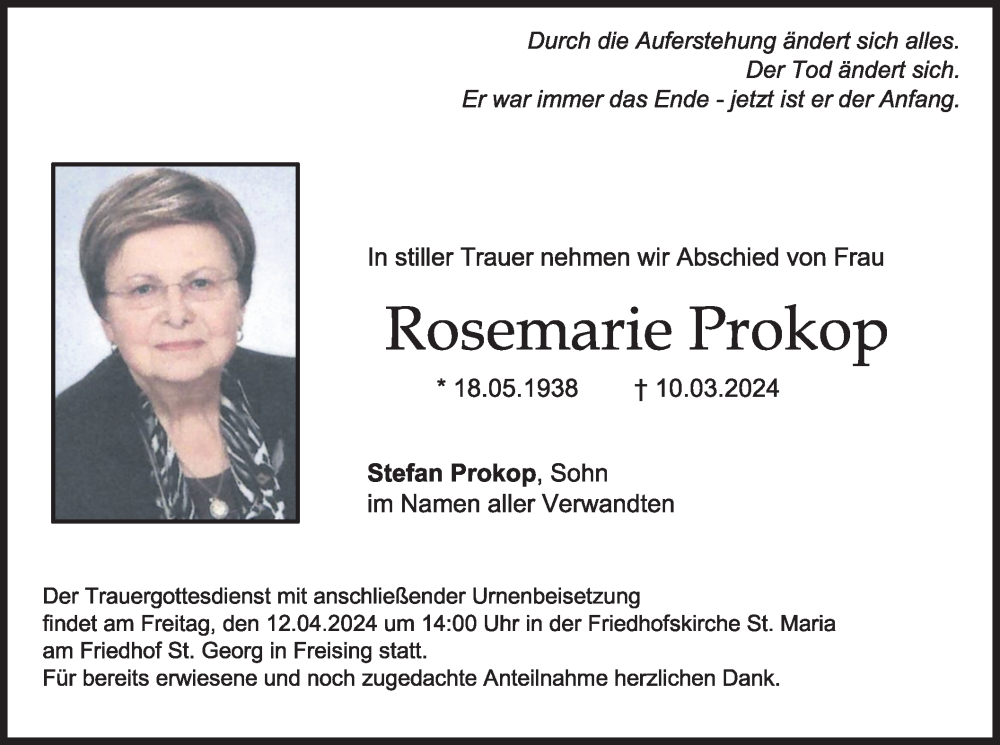 Hier finden Sie alle Traueranzeigen aus der Zeitung, die bisher für Rosemarie Prokop erschienen sind. Weitere Traueranzeigen, die in der Zeitung erscheinen, werden hier ebenfalls aufgelistet