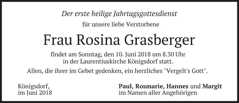 Hier finden Sie alle Traueranzeigen aus der Zeitung, die bisher für Rosina Grasberger erschienen sind. Weitere Traueranzeigen, die in der Zeitung erscheinen, werden hier ebenfalls aufgelistet