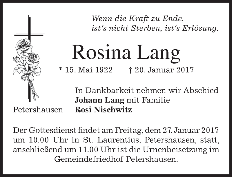Hier finden Sie alle Traueranzeigen aus der Zeitung, die bisher für Rosina Lang erschienen sind. Weitere Traueranzeigen, die in der Zeitung erscheinen, werden hier ebenfalls aufgelistet