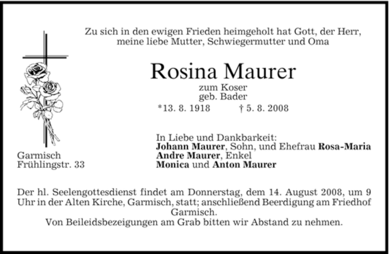 Hier finden Sie alle Traueranzeigen aus der Zeitung, die bisher für Rosina Maurer erschienen sind. Weitere Traueranzeigen, die in der Zeitung erscheinen, werden hier ebenfalls aufgelistet