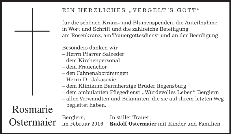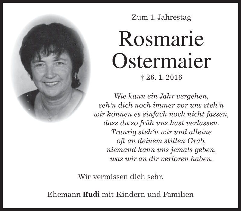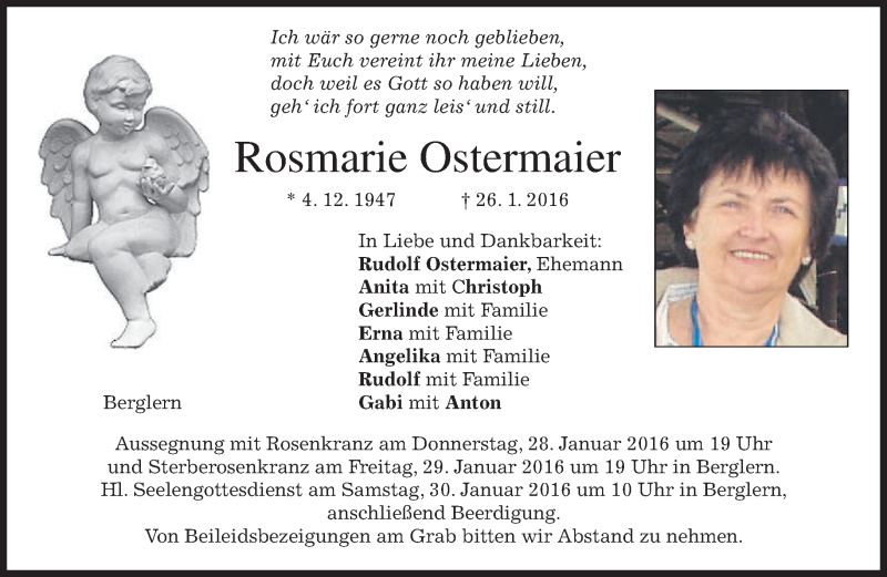 Hier finden Sie alle Traueranzeigen aus der Zeitung, die bisher für Rosmarie Ostermaier erschienen sind. Weitere Traueranzeigen, die in der Zeitung erscheinen, werden hier ebenfalls aufgelistet