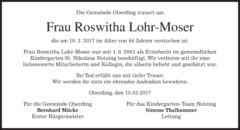 Hier finden Sie alle Traueranzeigen aus der Zeitung, die bisher für Roswitha Lohr-Moser erschienen sind. Weitere Traueranzeigen, die in der Zeitung erscheinen, werden hier ebenfalls aufgelistet