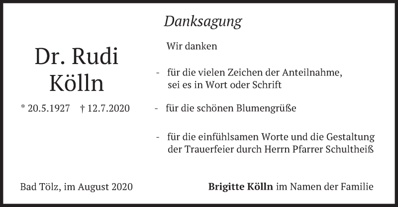 Hier finden Sie alle Traueranzeigen aus der Zeitung, die bisher für Rudi Kölln erschienen sind. Weitere Traueranzeigen, die in der Zeitung erscheinen, werden hier ebenfalls aufgelistet