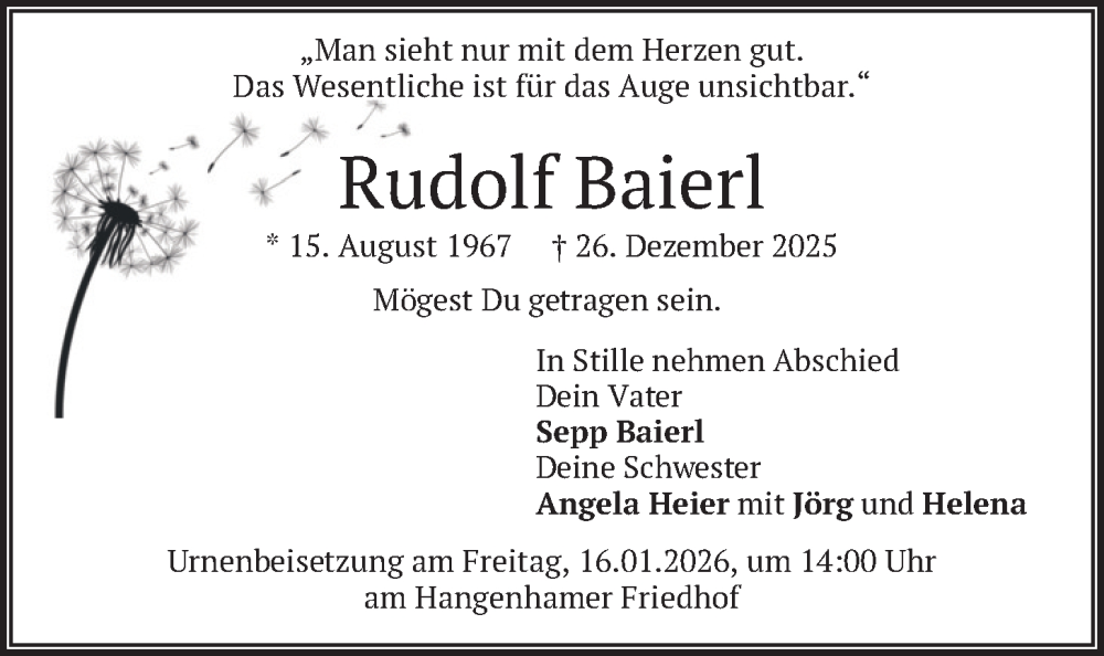 Hier finden Sie alle Traueranzeigen aus der Zeitung, die bisher für Rudolf Baierl erschienen sind. Weitere Traueranzeigen, die in der Zeitung erscheinen, werden hier ebenfalls aufgelistet