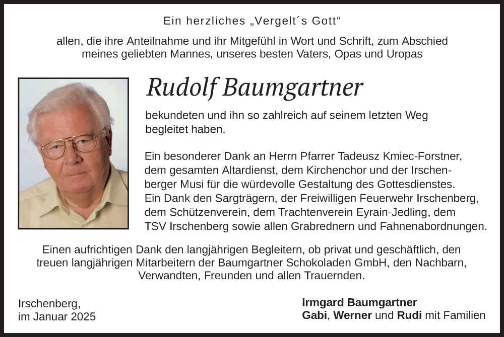 Hier finden Sie alle Traueranzeigen aus der Zeitung, die bisher für Rudolf Baumgartner erschienen sind. Weitere Traueranzeigen, die in der Zeitung erscheinen, werden hier ebenfalls aufgelistet
