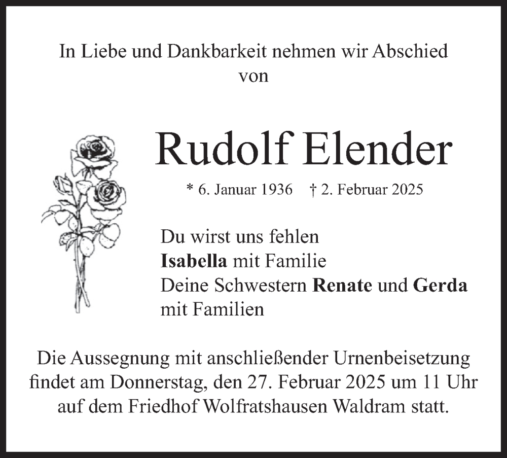 Hier finden Sie alle Traueranzeigen aus der Zeitung, die bisher für Rudolf Elender erschienen sind. Weitere Traueranzeigen, die in der Zeitung erscheinen, werden hier ebenfalls aufgelistet