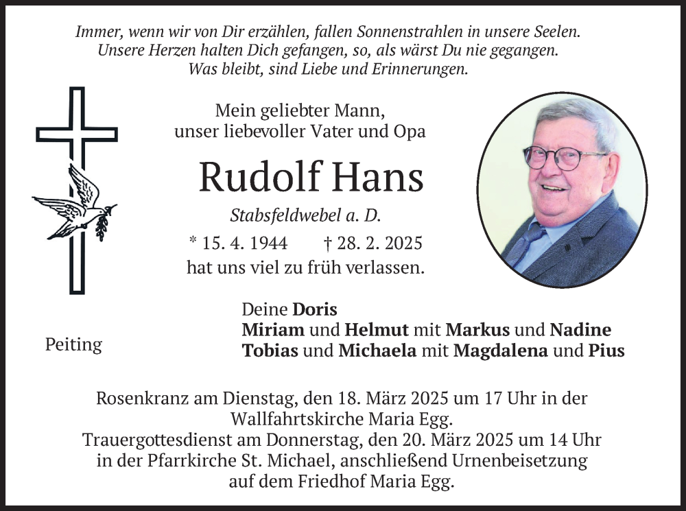Hier finden Sie alle Traueranzeigen aus der Zeitung, die bisher für Rudolf Hans erschienen sind. Weitere Traueranzeigen, die in der Zeitung erscheinen, werden hier ebenfalls aufgelistet