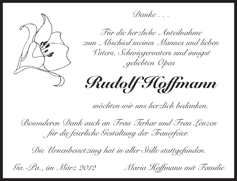 Hier finden Sie alle Traueranzeigen aus der Zeitung, die bisher für Rudolf Hoffmann erschienen sind. Weitere Traueranzeigen, die in der Zeitung erscheinen, werden hier ebenfalls aufgelistet