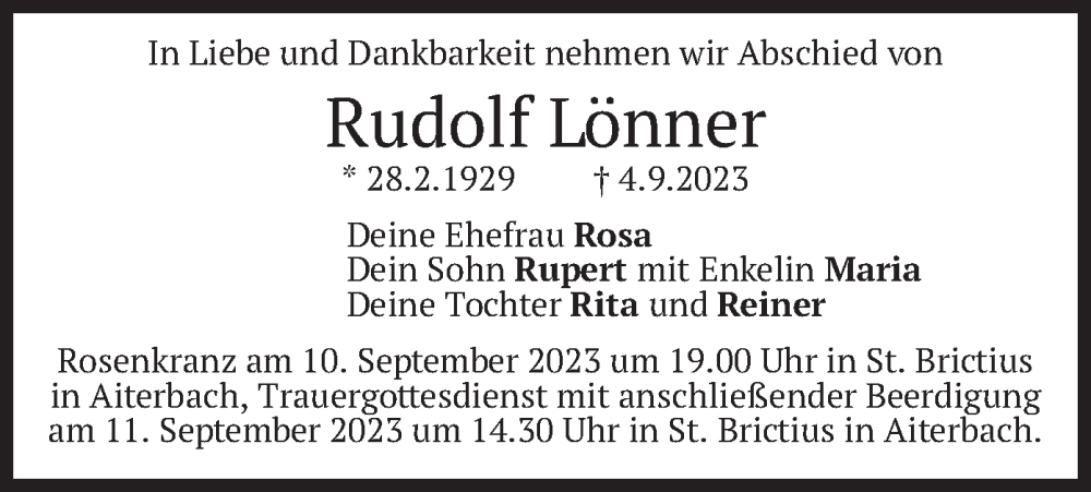 Hier finden Sie alle Traueranzeigen aus der Zeitung, die bisher für Rudolf Lönner erschienen sind. Weitere Traueranzeigen, die in der Zeitung erscheinen, werden hier ebenfalls aufgelistet