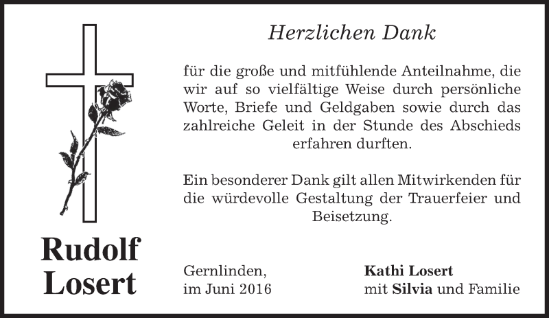 Hier finden Sie alle Traueranzeigen aus der Zeitung, die bisher für Rudolf Losert erschienen sind. Weitere Traueranzeigen, die in der Zeitung erscheinen, werden hier ebenfalls aufgelistet