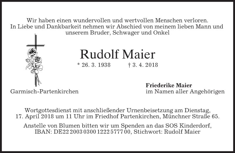 Hier finden Sie alle Traueranzeigen aus der Zeitung, die bisher für Rudolf Maier erschienen sind. Weitere Traueranzeigen, die in der Zeitung erscheinen, werden hier ebenfalls aufgelistet