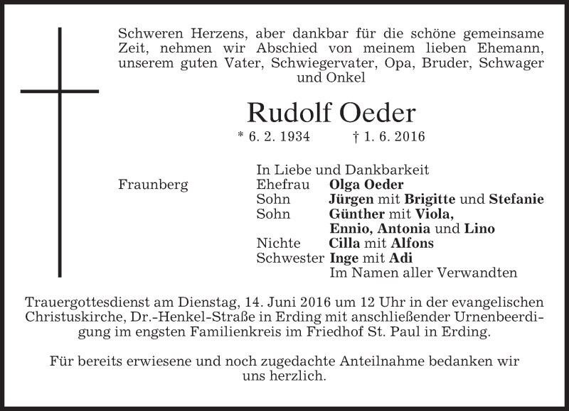 Hier finden Sie alle Traueranzeigen aus der Zeitung, die bisher für Rudolf Oeder erschienen sind. Weitere Traueranzeigen, die in der Zeitung erscheinen, werden hier ebenfalls aufgelistet