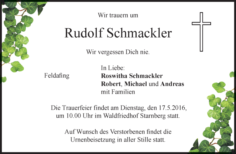Hier finden Sie alle Traueranzeigen aus der Zeitung, die bisher für Rudolf Schmackler erschienen sind. Weitere Traueranzeigen, die in der Zeitung erscheinen, werden hier ebenfalls aufgelistet