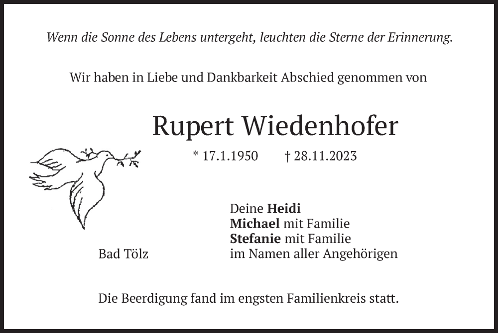 Hier finden Sie alle Traueranzeigen aus der Zeitung, die bisher für Rupert Wiedenhofer erschienen sind. Weitere Traueranzeigen, die in der Zeitung erscheinen, werden hier ebenfalls aufgelistet