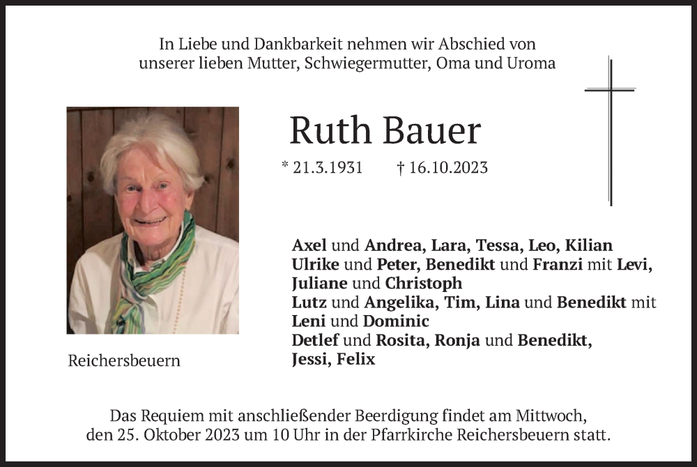 Hier finden Sie alle Traueranzeigen aus der Zeitung, die bisher für Ruth Bauer erschienen sind. Weitere Traueranzeigen, die in der Zeitung erscheinen, werden hier ebenfalls aufgelistet