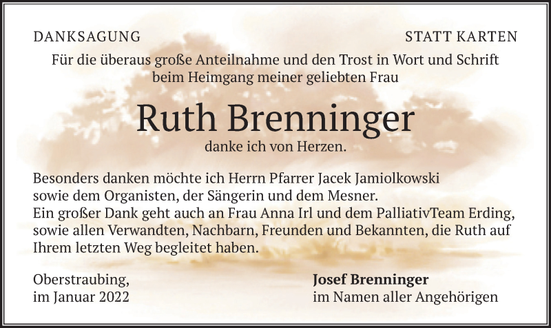 Hier finden Sie alle Traueranzeigen aus der Zeitung, die bisher für Ruth Brenninger erschienen sind. Weitere Traueranzeigen, die in der Zeitung erscheinen, werden hier ebenfalls aufgelistet