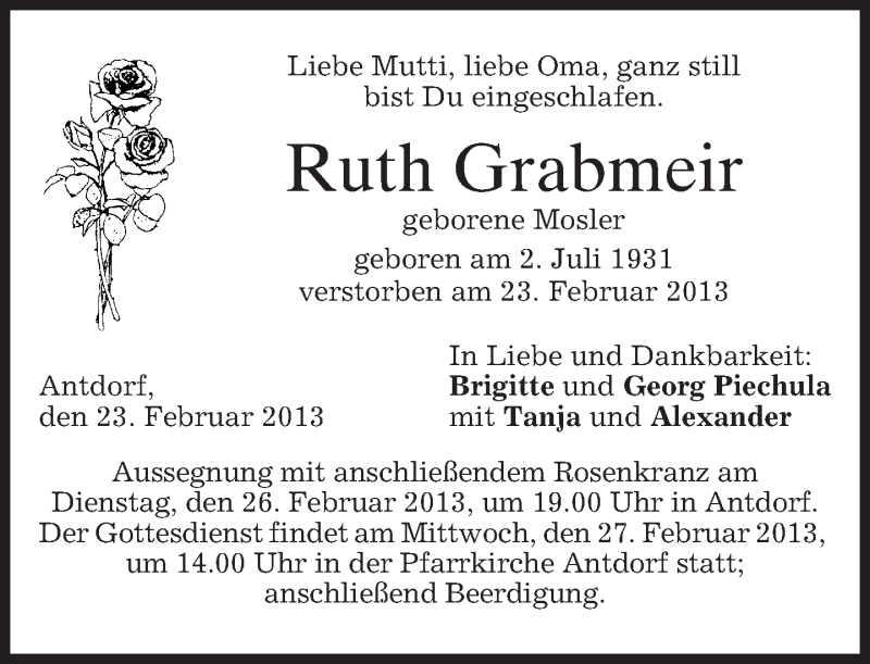 Hier finden Sie alle Traueranzeigen aus der Zeitung, die bisher für Ruth Grabmeir erschienen sind. Weitere Traueranzeigen, die in der Zeitung erscheinen, werden hier ebenfalls aufgelistet