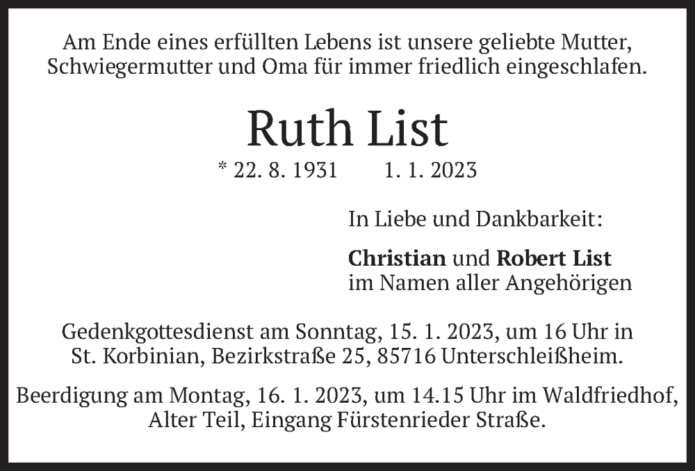 Hier finden Sie alle Traueranzeigen aus der Zeitung, die bisher für Ruth List erschienen sind. Weitere Traueranzeigen, die in der Zeitung erscheinen, werden hier ebenfalls aufgelistet