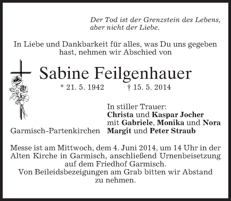 Hier finden Sie alle Traueranzeigen aus der Zeitung, die bisher für Sabine Feilgenhauer erschienen sind. Weitere Traueranzeigen, die in der Zeitung erscheinen, werden hier ebenfalls aufgelistet
