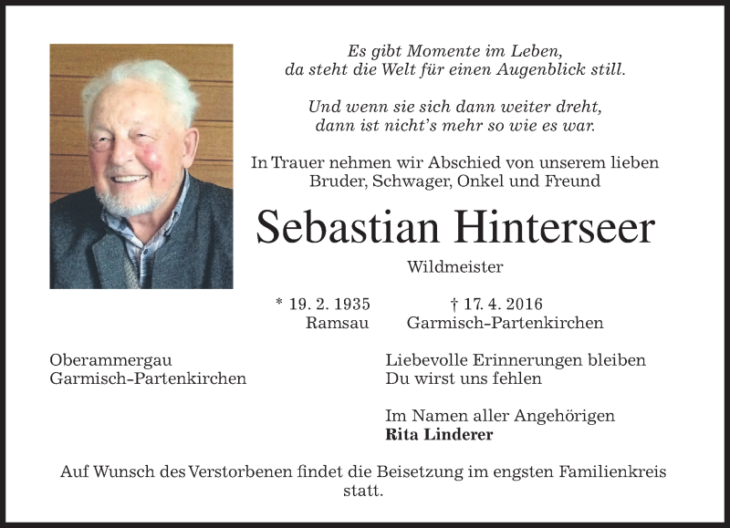 Hier finden Sie alle Traueranzeigen aus der Zeitung, die bisher für Sebastian Hinterseer erschienen sind. Weitere Traueranzeigen, die in der Zeitung erscheinen, werden hier ebenfalls aufgelistet