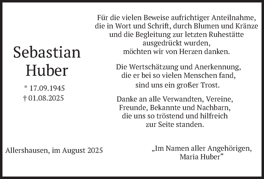 Hier finden Sie alle Traueranzeigen aus der Zeitung, die bisher für Sebastian Huber erschienen sind. Weitere Traueranzeigen, die in der Zeitung erscheinen, werden hier ebenfalls aufgelistet