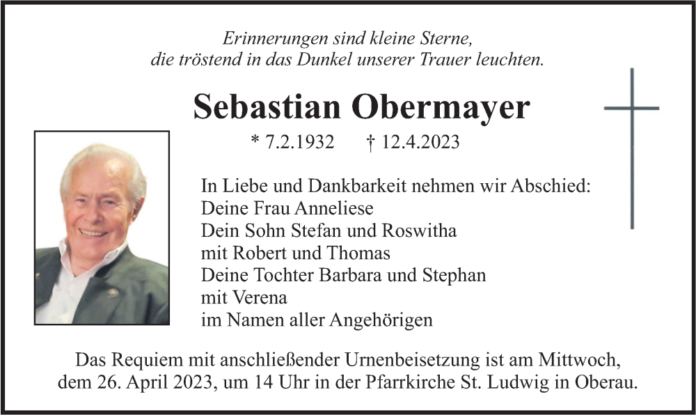 Hier finden Sie alle Traueranzeigen aus der Zeitung, die bisher für Sebastian Obermayer erschienen sind. Weitere Traueranzeigen, die in der Zeitung erscheinen, werden hier ebenfalls aufgelistet