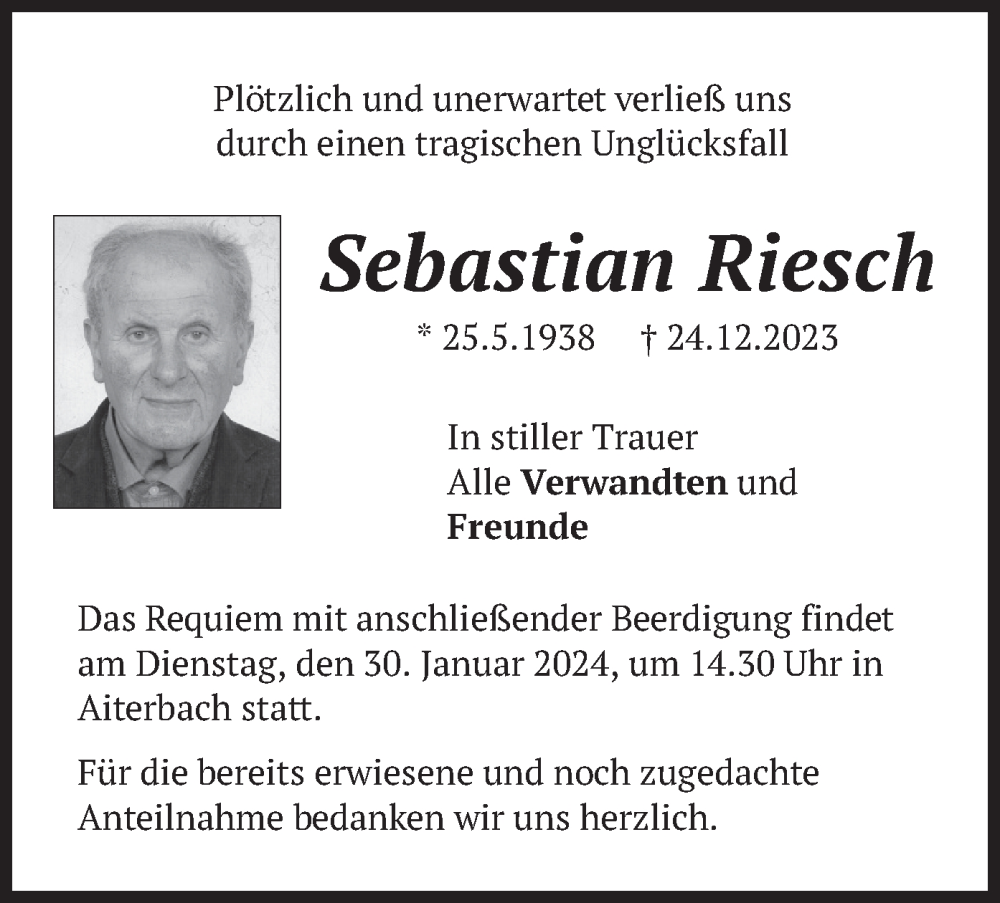 Hier finden Sie alle Traueranzeigen aus der Zeitung, die bisher für Sebastian Riesch erschienen sind. Weitere Traueranzeigen, die in der Zeitung erscheinen, werden hier ebenfalls aufgelistet