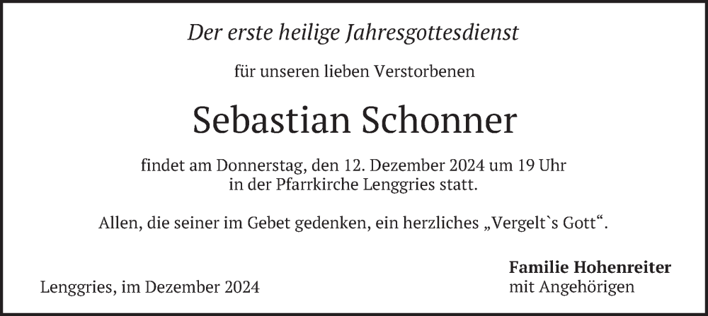 Hier finden Sie alle Traueranzeigen aus der Zeitung, die bisher für Sebastian Schonner erschienen sind. Weitere Traueranzeigen, die in der Zeitung erscheinen, werden hier ebenfalls aufgelistet