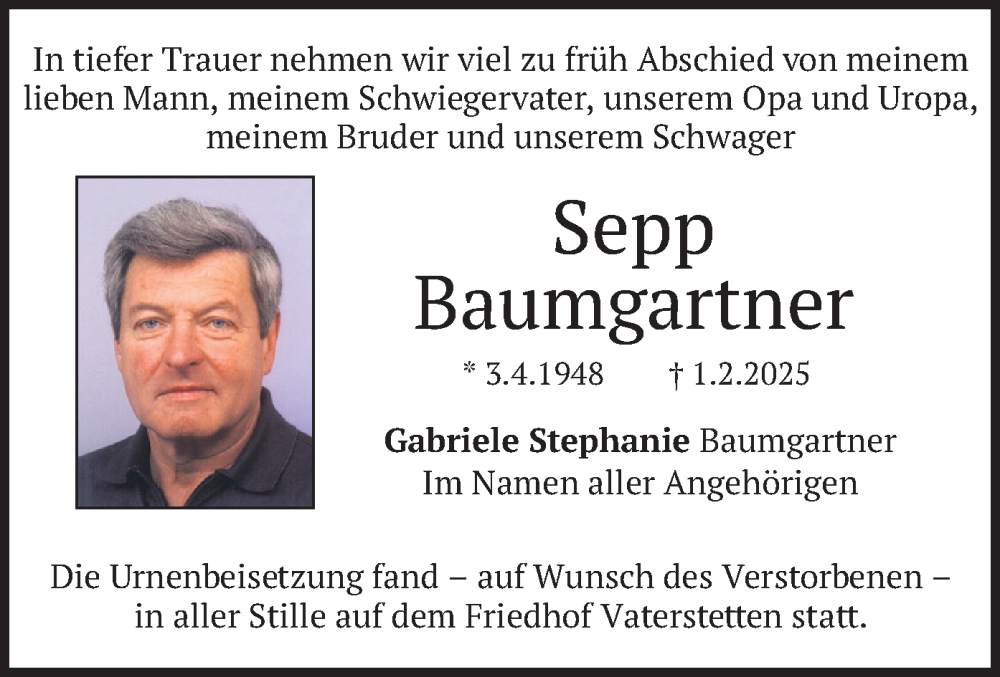 Hier finden Sie alle Traueranzeigen aus der Zeitung, die bisher für Sepp Baumgartner erschienen sind. Weitere Traueranzeigen, die in der Zeitung erscheinen, werden hier ebenfalls aufgelistet
