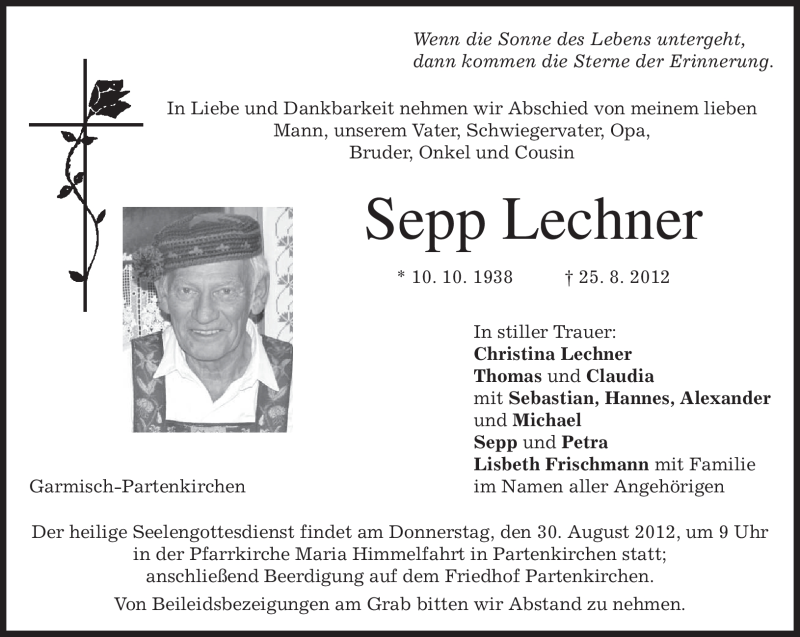 Hier finden Sie alle Traueranzeigen aus der Zeitung, die bisher für Sepp Lechner erschienen sind. Weitere Traueranzeigen, die in der Zeitung erscheinen, werden hier ebenfalls aufgelistet