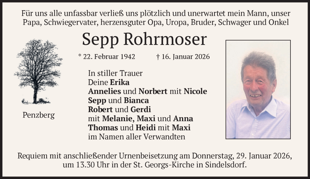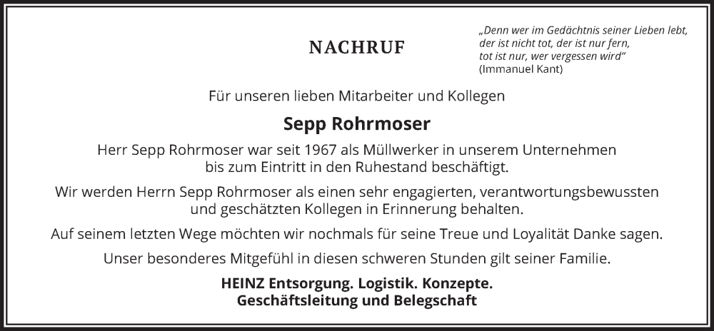 Hier finden Sie alle Traueranzeigen aus der Zeitung, die bisher für Sepp Rohrmoser erschienen sind. Weitere Traueranzeigen, die in der Zeitung erscheinen, werden hier ebenfalls aufgelistet