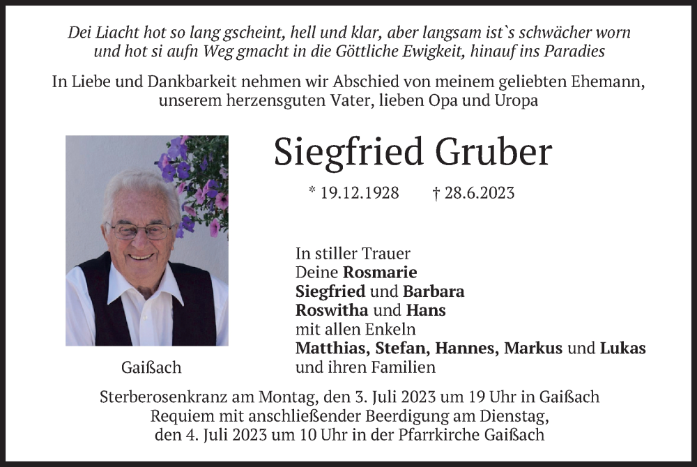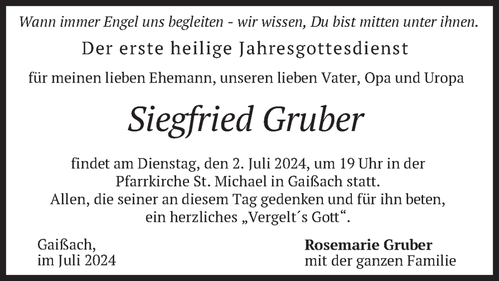 Hier finden Sie alle Traueranzeigen aus der Zeitung, die bisher für Siegfried Gruber erschienen sind. Weitere Traueranzeigen, die in der Zeitung erscheinen, werden hier ebenfalls aufgelistet