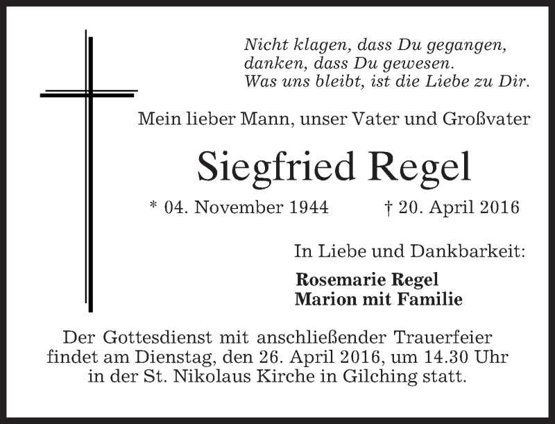 Hier finden Sie alle Traueranzeigen aus der Zeitung, die bisher für Siegfried Regel erschienen sind. Weitere Traueranzeigen, die in der Zeitung erscheinen, werden hier ebenfalls aufgelistet
