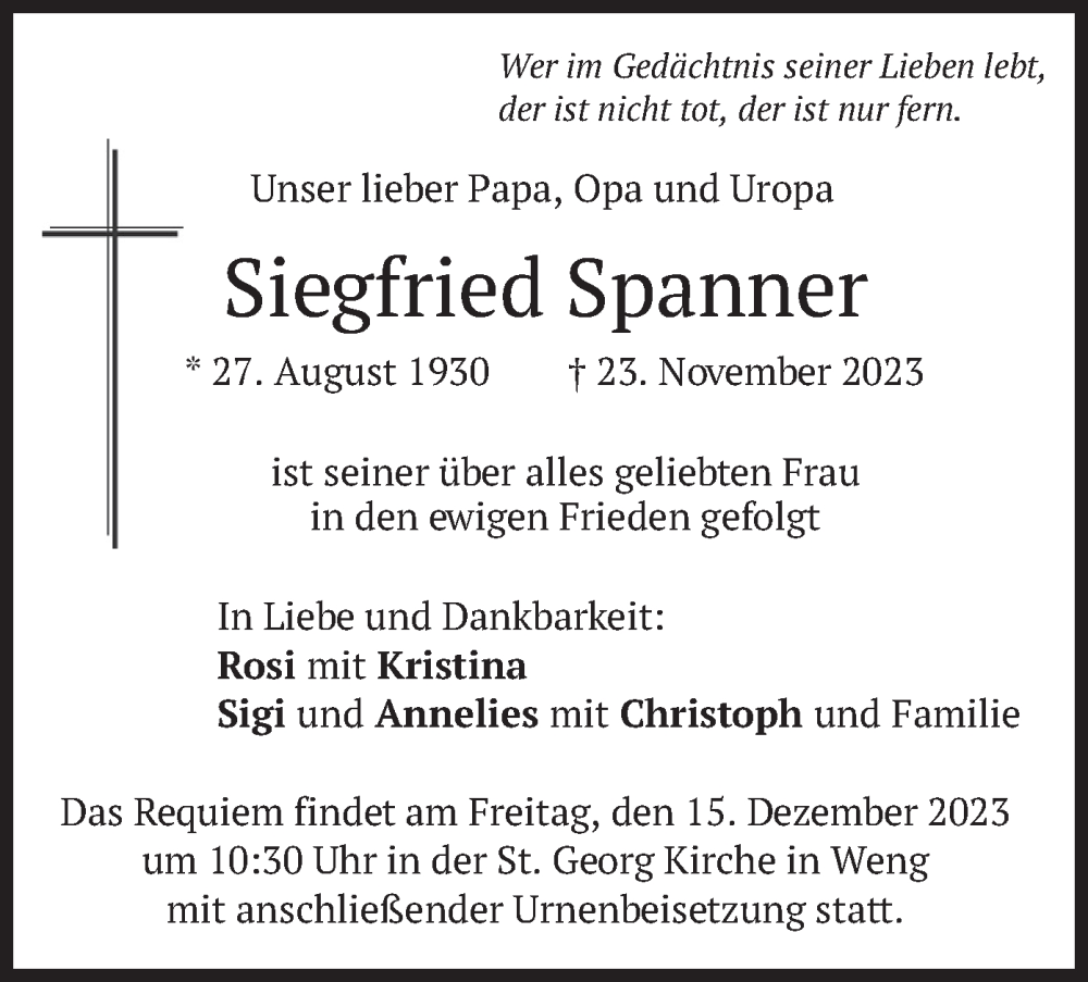 Hier finden Sie alle Traueranzeigen aus der Zeitung, die bisher für Siegfried Spanner erschienen sind. Weitere Traueranzeigen, die in der Zeitung erscheinen, werden hier ebenfalls aufgelistet