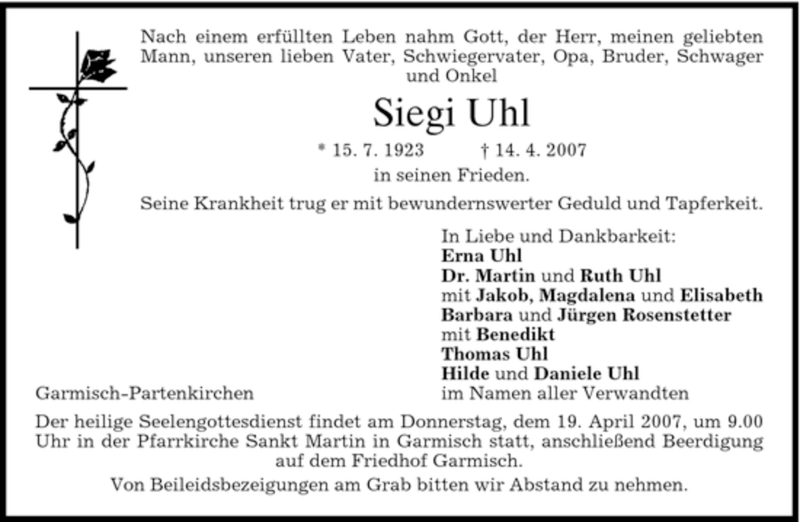 Hier finden Sie alle Traueranzeigen aus der Zeitung, die bisher für Siegi Uhl erschienen sind. Weitere Traueranzeigen, die in der Zeitung erscheinen, werden hier ebenfalls aufgelistet