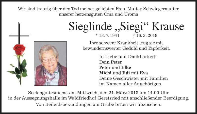 Hier finden Sie alle Traueranzeigen aus der Zeitung, die bisher für Sieglinde Krause erschienen sind. Weitere Traueranzeigen, die in der Zeitung erscheinen, werden hier ebenfalls aufgelistet