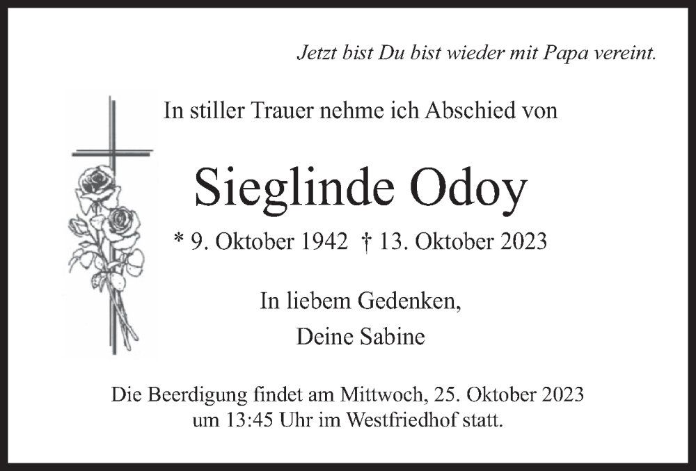 Hier finden Sie alle Traueranzeigen aus der Zeitung, die bisher für Sieglinde Odoy erschienen sind. Weitere Traueranzeigen, die in der Zeitung erscheinen, werden hier ebenfalls aufgelistet