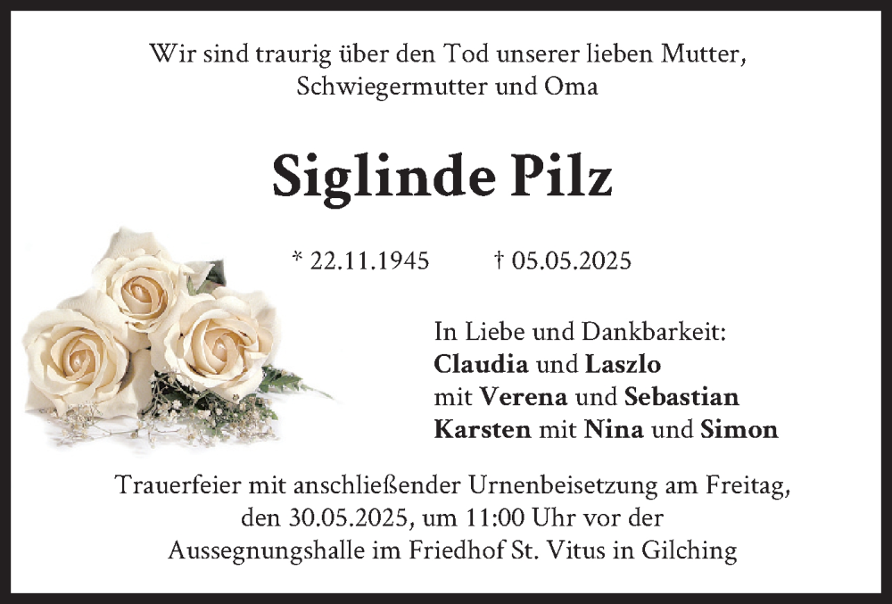 Hier finden Sie alle Traueranzeigen aus der Zeitung, die bisher für Siglinde Pilz erschienen sind. Weitere Traueranzeigen, die in der Zeitung erscheinen, werden hier ebenfalls aufgelistet