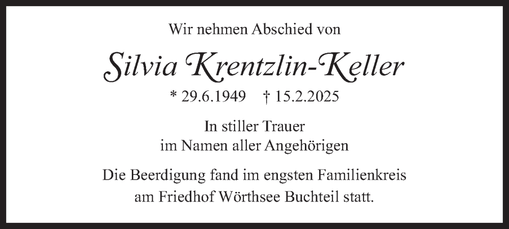 Hier finden Sie alle Traueranzeigen aus der Zeitung, die bisher für Silvia Krentzlin-Keller erschienen sind. Weitere Traueranzeigen, die in der Zeitung erscheinen, werden hier ebenfalls aufgelistet