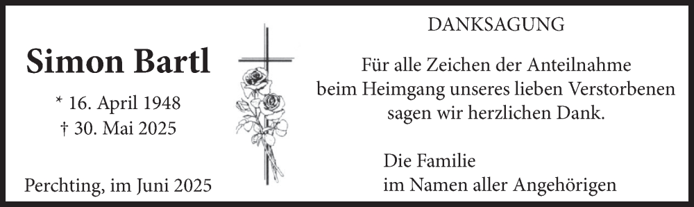 Hier finden Sie alle Traueranzeigen aus der Zeitung, die bisher für Simon Bartl erschienen sind. Weitere Traueranzeigen, die in der Zeitung erscheinen, werden hier ebenfalls aufgelistet