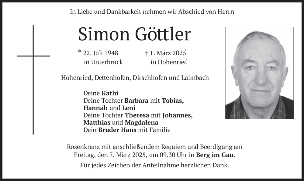 Hier finden Sie alle Traueranzeigen aus der Zeitung, die bisher für Simon Göttler erschienen sind. Weitere Traueranzeigen, die in der Zeitung erscheinen, werden hier ebenfalls aufgelistet