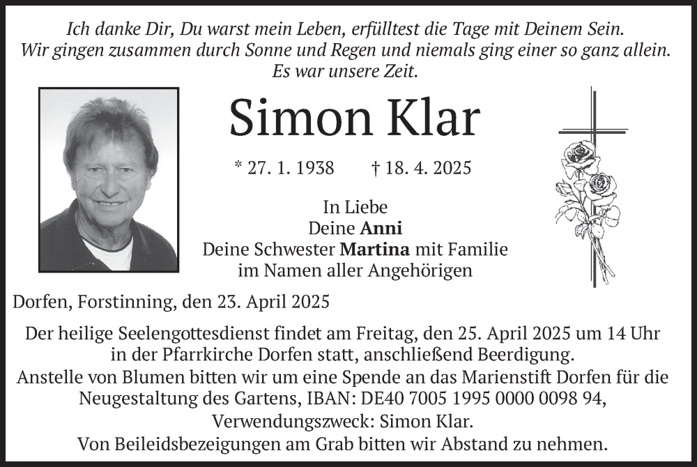 Hier finden Sie alle Traueranzeigen aus der Zeitung, die bisher für Simon Klar erschienen sind. Weitere Traueranzeigen, die in der Zeitung erscheinen, werden hier ebenfalls aufgelistet