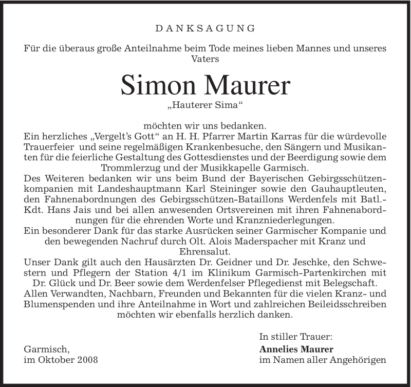 Hier finden Sie alle Traueranzeigen aus der Zeitung, die bisher für Simon Maurer erschienen sind. Weitere Traueranzeigen, die in der Zeitung erscheinen, werden hier ebenfalls aufgelistet