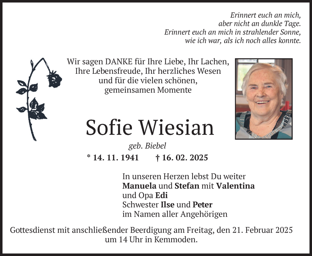 Hier finden Sie alle Traueranzeigen aus der Zeitung, die bisher für Sofie Wiesian erschienen sind. Weitere Traueranzeigen, die in der Zeitung erscheinen, werden hier ebenfalls aufgelistet
