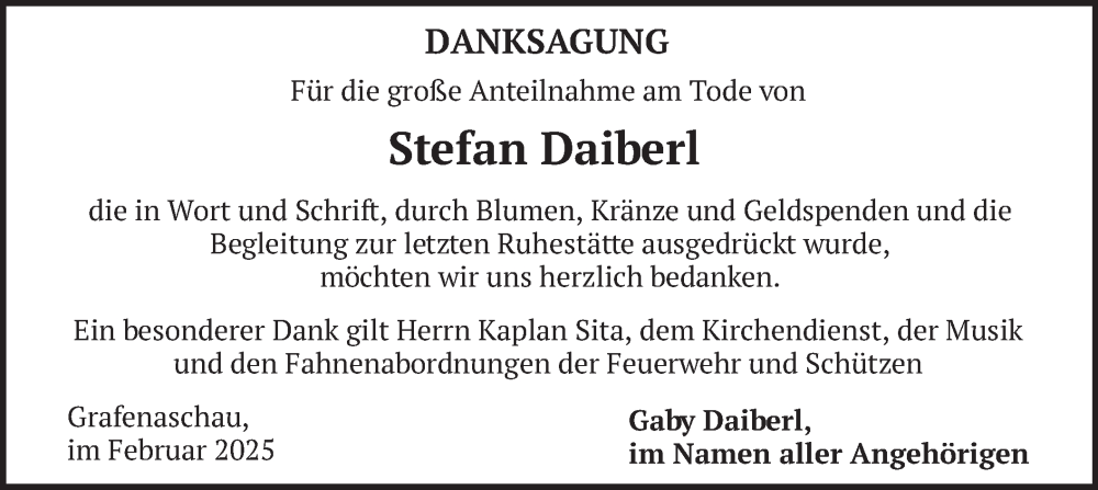 Hier finden Sie alle Traueranzeigen aus der Zeitung, die bisher für Stefan Daiberl erschienen sind. Weitere Traueranzeigen, die in der Zeitung erscheinen, werden hier ebenfalls aufgelistet