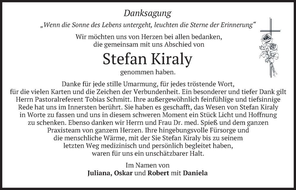 Hier finden Sie alle Traueranzeigen aus der Zeitung, die bisher für Stefan Kiraly erschienen sind. Weitere Traueranzeigen, die in der Zeitung erscheinen, werden hier ebenfalls aufgelistet