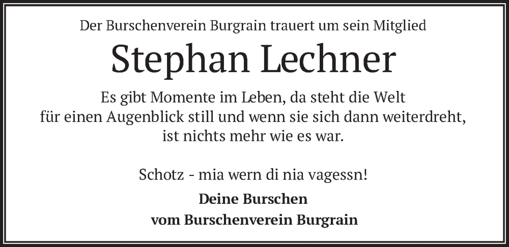 Hier finden Sie alle Traueranzeigen aus der Zeitung, die bisher für Stephan Lechner erschienen sind. Weitere Traueranzeigen, die in der Zeitung erscheinen, werden hier ebenfalls aufgelistet