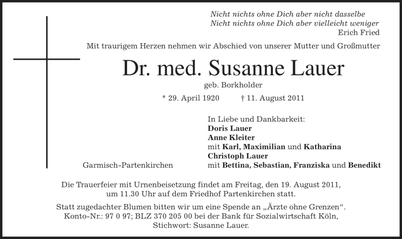 Hier finden Sie alle Traueranzeigen aus der Zeitung, die bisher für Susanne Lauer erschienen sind. Weitere Traueranzeigen, die in der Zeitung erscheinen, werden hier ebenfalls aufgelistet