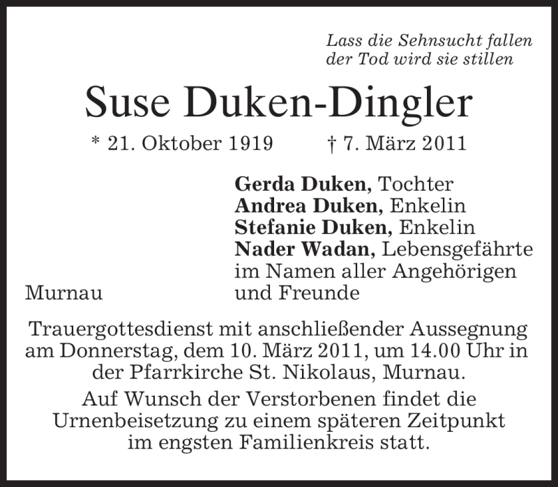 Hier finden Sie alle Traueranzeigen aus der Zeitung, die bisher für Suse Duken-Dingler erschienen sind. Weitere Traueranzeigen, die in der Zeitung erscheinen, werden hier ebenfalls aufgelistet